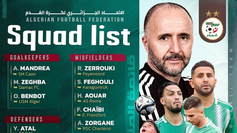 في المقابل، استبعد مهندس التتويج بكان 2019 محمد أمين محيوص مهاجم نادي إيفردون السويسري وبغداد بونجاح وحماد عبد اللي.