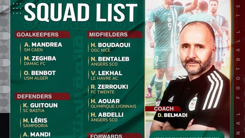 وأعلن الناخب الوطني جمال بلماضي، عن قائمة اللاعبين المستدعين لتربص شهر جوان، والتي حملت في طياتها عدة مفاجآت، على غرار تواجد نجم ليون حسام عوار وحسام عبد اللّي لاعب أنجي الفرنسي إلى جانب مهاجم اتحاد العاصمة أيمن محيوص.