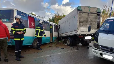 أصيب 21 شخصا بجروح مختلفة في حادث اصطدام بين شاحنة و حافلة لنقل المسافرين تشغل خط سكيكدة – عين قشرة، بجانب الإقامة الجامعية 05 بلدية و دائرة الحدائق، حسب ما أفاد به اليوم الأحد بيان للمديرية العامة للحماية المدنية.