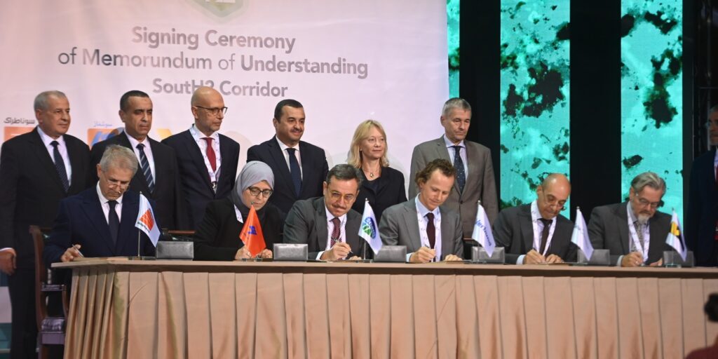 وقد ترأس، محمد عرقاب، وزير الطاقة والمناجم، مراسم التوقيع التي نظمت بمركز المؤتمرات بوهران، وذلك بحضور أعضاء من الحكومة، وسفراء كل من إيطاليا وألمانيا والنمسا، إلى جانب الرئيس المدير العام لمجمع سوناطراك، رشيد حشيشي، والرئيس المدير العام لمجمع سونلغاز، مراد عجال، وهانس- يواكيم بولك، عضو مجلس الإدارة لشركة في.أن.جي، والسيد سيرجيو موليساني، مدير الدائرة الدولية لشركة سنام، فرانشيسكو كاريا، الرئيس المدير العام لشركة سي كوريدور، وفرانس هيلم، المدير العام لشركة فيربوند _رين هيدروجين. ستُمكّن مذكرة التفاهم هذه الأطراف المعنية من دراسة فرص تنفيذ مشروع متكامل متعدد الأطراف يشمل مجمل سلسلة القيمة للهيدروجين الأخضر عبر “ساوث2 كوريدور”. وسيلعب مشروع “ساوث 2 كوريدور” دوراً محورياً في تقليص التبعية الطاقوية على الطاقة الأحفورية، وكذا ترقية مسعى التحول الطاقوي نحو اقتصاد منخفض الكربون ومستدام. إنّ تجسيد هذا المشروع الطموح يتوفر على القدرة لتلبية احتياجات السوق الأوروبية من الطاقة الخضراء، وسيسمح أيضًا بتعزيز مكانة الجزائر كمورد رئيسي لأوروبا بالطاقة.