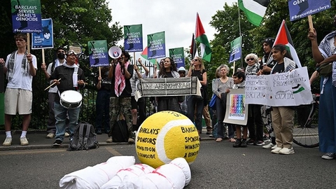 وتجمع المحتجون في إحدى المناطق التي تقام فيها منافسات البطولة، بالعاصمة لندن، رافعين لافتات عليها عبارات من قبيل “أوقفوا الإبادة الجماعية”، و”بنك باركليز يموّل الإبادة الجماعية”.