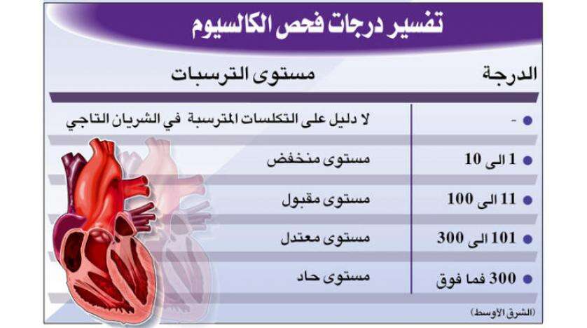 وباستخدام الجهازين، يخرج الفحص بتصور يكشف عن تكلسات الكالسيوم على جدران شرايين القلب. ويتم تسجيل كمية التكلسات على مقياس من صفر إلى 300 وأعلى. وكلما انخفضت الدرجة المسجلة انخفضت تكلسات الكالسيوم المتراكمة، وبصفة عامة، تقل أيضاً احتمالية الإصابة بالنوبات القلبية أو السكتات الدماغية.