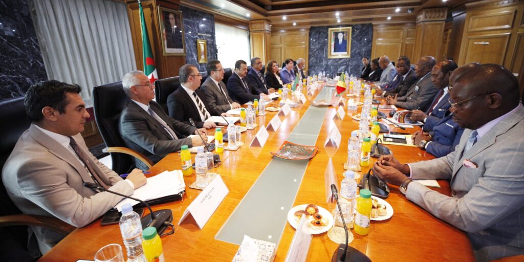 استقبل وزير الطاقة والمناجم، محمد عرقاب، الاثنين بمقر دائرته الوزارية، وزير الدولة، وزير الصناعات المنجمية والجيولوجيا لجمهورية الكونغو، بيار أوبا ، والذي يقوم بزيارة عمل الى الجزائر على رأس وفد هام من وزارة الصناعات المنجمية والجيولوجيا الكونغولية وكذا الرئيس المدير العام للشركة الكونغولية المنجمية Sapro Mayoko Sa، والمدير العام لمركز البحث الجيولوجي والمنجمي الكونغولي، بالاضافة الى حضور سعادة سفير جمهورية الكونغو لدى الجزائر، وهذا في إطار الجهود المشتركة الرامية لتطوير وتعزيز العلاقات الأخوية التاريخية الراسخة بين البلدين.