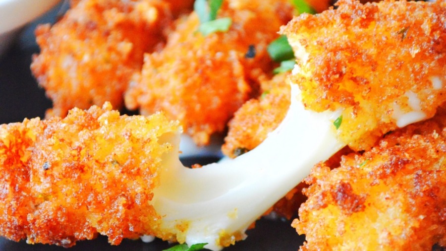 اغمسي اعواد الموزاريلا اولا بخليط الفرينة ونشاء الذرة حتى تتغطى كل الجوانب