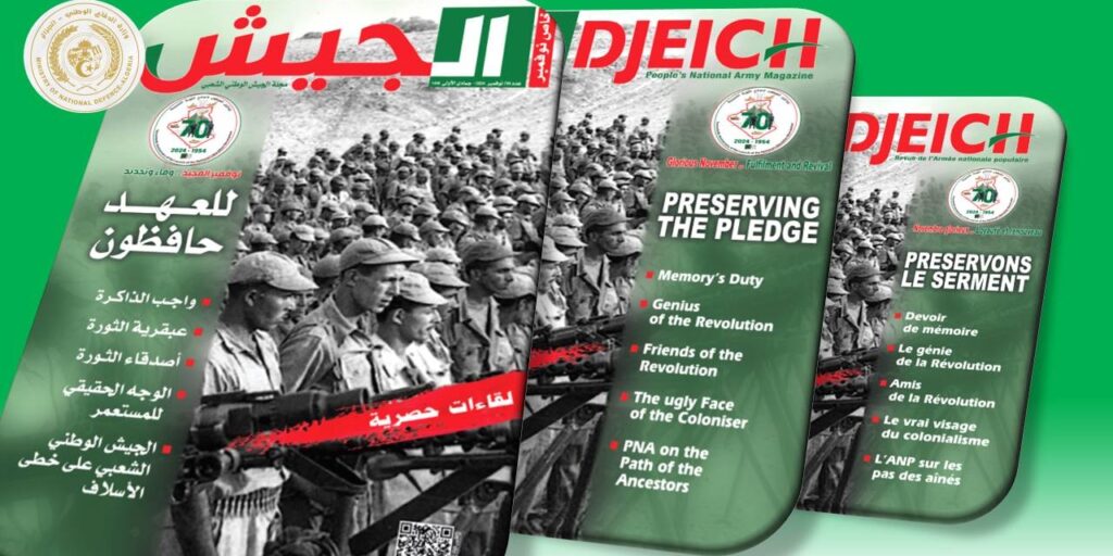 وأكدت مجلة الجيش في افتتاحيتها الخاصة بالثورة المجيدة، أن الشعب الجزائري خاض في الجبال الشاهقة والصحراء الشاسعة وقُرانا ومدننا طيلة سبع سنوات ونصف، كفاحا مسلحا مريرا، ضد أعتى قوة استعمارية وقتذاك، ولم يكن لترعبه الآلة العسكرية الاستعمارية ولا القمع الهمجي والتعذيب الممنهج، ولم تكن لسياسية الأرض المحروقة والقتل الجماعي واستعمال الأسلحة المحرمة دوليا وعدم تكافؤ موازين القوى لتحول دون تجسيد مراده في استعادة السيادة الوطنية، الذي جعله شعبنا الهدف الأسمى والغاية الوحيدة. إننا ونحن نحتفي بهذه المناسبة الخالدة، بقدر ما نستحضر بكل فخر واعتزاز، وبخالص العرفان، البطولات العظيمة والتضحيات الجسام التي قدمها شعبنا الأبي في مواجهة قوى الظلم والطغيان، في أبلغ صور تشبُّثه بأرضه ودفاعه المستميت عن وجوده كأمة جزائرية ضاربة جذورها في هذه الأرض الطيبة، نجدد عزمنا والتزامنا بالسير على خطى أسلافنا الميامين وصون وديعتهم الغالية التي لا تقدر بثمن. على هذا النهج، ومن باب الوفاء بالوعد وصون العهد، فإن بلادنا تسير بخطى ثابتة على درب التطور والازدهار نحو آفاق واعدة، لا سيما وأن المقومات التي تمكننا من ذلك، أضحت متوفرة الآن أكثر من أي وقت مضى في ظل الإنجازات الملموسة المحققة، حيث أصبحت الطريق معبدة لرفع كل التحديات الراهنة والمستقبلية في مـختلف المجالات، وتعزيز رصيد المكاسب، للمضي ببلادنا قُدُما نحو النهضة والنماء في كنف الأمن والاستقرار، مثلما تطلع إليها شهداؤنا الأبرار ومجاهدونا الأخيار الذين استحقوا مثلما أكده رئيس الجمهورية، عبد المجيد تبون الإكبار والإجلال في جزائر شامـخة بشعبها الأبي وشبابها الطموح الحامل لشعلة استكمال المسيرة الوطنية، نحو جزائر جديدة، قوية بمقدراتها، مؤزرة بسواعد وعبقرية بناتها وأبنائها.. وفية لتاريخها الوطني.. جزائر جديدة عازمة على تحقيق أفضل المستويات في معدلات التنمية الاقتصادية والاجتماعية، عبر تسخير الإمكانيات، وتجنيد الطاقات ومـحاربة التقاعس والتحرر من العراقيل والذهنيات البيروقراطية_. وفي هذا السياق، أكدت الافتتاحية تواصل بلادنا بكل عزيمة وإصرار استكمال مشاريع إستراتيجية كبرى في مجالات متعددة، أهمها تحقيق الاكتفاء الذاتي من الغذاء وتعزيز المشاريع الاستثمارية والمؤسسات الناشئة التي ستتيح خلق مئات الآلاف من مناصب الشغل لفائدة شبابنا، فضلا عن الحفاظ على نفس وتيرة النمو المحققة والرفع من قيمة الصادرات خارج المحروقات، مع تركيز الاهتمام على ملف السكن بمختلف صيغه، إلى جانب الحفاظ على القدرة الشرائية للمواطنين وطي ملف مناطق الظل، وكذا تعزيز الفلاحة وإعطاء الصناعة الوطنية المكانة التي تستحق ضمن الاقتصاد الوطني، بما في ذلك الصناعة العسكرية التي يتم تطويرها، لتلبية احتياجاتنا الوطنية والتوجه للتصدير في مرحلة قادمة. وإذ نحتفل بهذه المناسبة العظيمة، التي نسترجع خلالها الملاحم التي سطرها جيش التحرير الوطني، فإننا نفتخر في الوقت ذاته بما بلغه سليله الجيش الوطني الشعبي اليوم، من تطور واحترافية، تتجلى من خلال النتائج المعتبرة التي يحققها وهو ينفذ مهامه على جميع المستويات، سواء في مجال التكوين أو التجهيز أو التحضير القتالي، ولا سيما في مجال مكافحة الإرهاب والجريمة المنظمة وحماية حدودنا الوطنية، وهي مهام يستبسل جيشنا العتيد أيَّما استبسال في أدائها، مواصلا سعيه الحثيث لامتلاك كل عوامل القوة التي تمكنه من كسب مـختلف الرهانات ومواجهة كافة التهديدات التي تفرضها البيئة الإقليمية المتقلبة والأوضاع الدولية المضطربة، مثلما أكده السيد الفريق أول السعيد شنڤريحة، رئيس أركان الجيش الوطني الشعبي قائلا: _إن المحطات التاريخية الخالدة لبلادنا إذ تذكرنا على الدوام بتضحيات أسلافنا في جيش التحرير الوطني، الذي تحمل وأوفى تماما بمسؤولية استرجاع استقلال الجزائر وسيادتها الوطنية من براثن المستعمر الغاشم، فإنها تؤشر على حجم مسؤولية الجيش ا