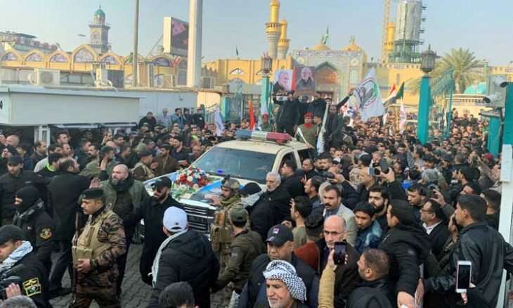 وهتف المشاركون في التشييع في بغداد: “الموت لأمريكا”، في موكب حول نعشي الجنرال الإيراني سليماني ونائب رئيس هيئة الحشد الشعبي المهندس.