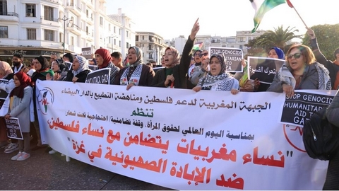 تتصاعد الأصوات والنداءات الرافضة لتطبيع النظام المخزني مع الكيان الصهيوني، حيث شهدت مدن مغربية عديدة مظاهرات ووقفات تضامنية نسائية، للمطالبة بحماية النساء الفلسطينيات في قطاع غزة، في ضوء تواصل العدوان الصهيوني على القطاع، وبإسقاط كل أشكال التطبيع الرسمي للنظام المغربي مع الكيان الصهيوني.