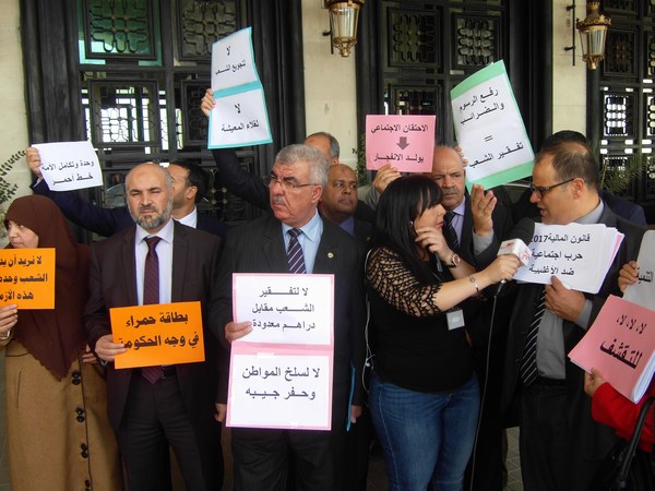 ورفع نواب المعارضة قبل بداية التصويت لافتات وشعارات بأروقة البرلمان أبرزها ” لا للمساس بمكاسب العمال ” ، ”لا لتجويع الشعب” ، ” بطاقة حمراء في وجه الحكومة ” ، ” قانون المالية إعلان الحرب على الشعب” ، إضافة إلى العديد من الشعارات التي تندد بقانون المالية.