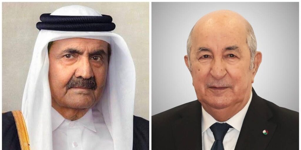 و جاء في البيان تلقى اليوم رئيس الجمهورية السيد عبد المجيد تبون مكالمة هاتفية, من أخيه صاحب السمو الشيخ حمد بن خليفة آل ثاني, الأمير السابق لدولة قطر الشقيقة, هنأه فيها بمناسبة فوزه بعهدة رئاسية ثانية بدوره, شكر السيد رئيس الجمهورية أخاه أمير دولة قطر السابق على هذه التهنئة, وكذا عائلته الكريمة