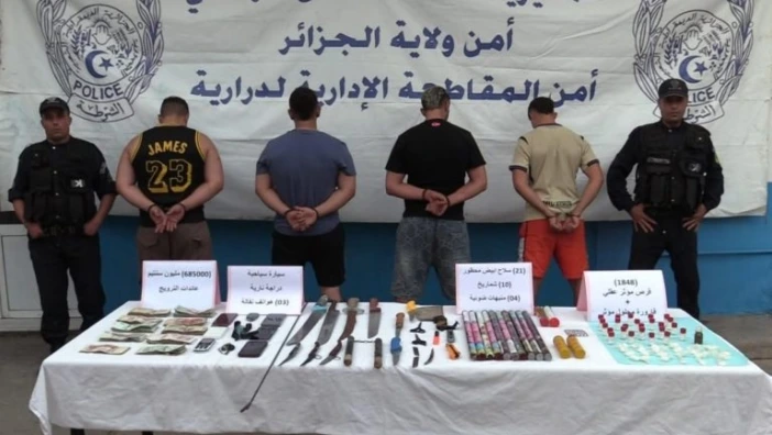 وكشف بيان لذات المصالح، عن تمكن عناصرها من توقيف 4 أشخاص، ينشطون ضمن عصابة أحياء، زرعوا الرعب وسط الساكنة، حيث ضبط بحوزتهم 1848 كبسولة من المؤثرات العقلية، أسلحة بيضاء، كما تم خلالها استرجاع مبلغ مالي، ودراجة نارية ومركبة، تستعملان في عمليات السرقة. وأرجع ذات المصدر حيثيات العملية، لورود معلومات مفدها، وجود عصابة زرعت الرعب وسط المواطنين، حيث باشرت مصالح الأمن تحرياتها، لتتمكن من الإيقاع بها في ظرف وجيز.