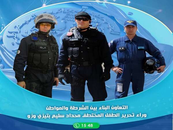وأضاف البيان أن ثقافة التبيلغ التي أضحى يتحلى بها المواطن، ساهمت بشكل كبير في تحرير الطفل المختطف محداد سليم، والذي تم التبليغ عن إختفائه يوم 27 أفريل 2017، بعد تقرب أحد المواطنين من مصالح الشرطة بأمن دائرة بني دوالة بتيزي وزو وإدلائه بمعلومات هامة أفضت إلى تحديد مكان تواجده وتدخل فرق الشرطة المختصة في وقت قياسي لتحريره سالما ومعافى.