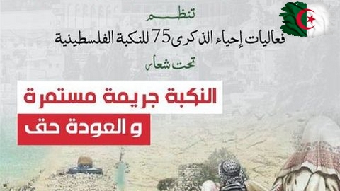 تحتضن الجزائر غدا الاثنين بالمركز الدولي للمؤتمرات “عبد اللطيف رحال” فعاليات ندوة دولية تخليدا للذكرى الـ75 للنكبة الفلسطينية تحت شعار “النكبة جريمة مستمرة والعودة حق”.