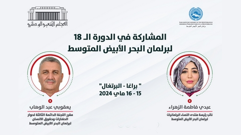 يشارك النائبان فاطمة الزهراء عبدي، نائب رئيسة منتدى النساء البرلمانيات لبرلمان البحر الأبيض المتوسط، وعبد الوهاب يعقوبي، مقرر اللجنة الدائمة الثالثة لحوار الحضارات وحقوق الانسان بذات الهيئة، في أشغال الدورة الـ18 لبرلمان البحر الأبيض المتوسط، التي من المزمع عقدها ببراغا في البرتغال، اليوم وغدا.
