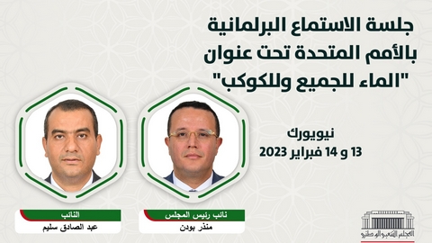 يشارك المجلس الشعبي الوطني، ممثلا بنائب الرئيس، منذر بودن، في أشغال جلسة الاستماع البرلمانية السنوية للأمم المتحدة، المقرر عقدها اليوم وغدا، بنيويورك تحت عنوان “الماء للجميع وللكوكب: لنوقف التبذير ولنغير المعطى ولنستثمر في المستقبل”.
