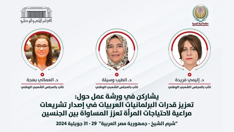 يشارك وفد عن المجلس الشعبي الوطني، مكون من النواب، الدكتور فريدة إليمي، ووسيلة الطيب وبهجة العمالي، في ورشة عمل حول: ” تعزيز قدرات البرلمانيات العربيات في إصدار تشريعات مراعية لاحتياجات المرأة تعزز المساواة بين الجنسين”.