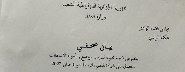 اصدر وكيل الجمهورية لدى مجلس قضاء ولاية الوادي بيانا بخصوص قضية محاولة تسريب مواضيع وأجوبة الامتحانات للحصول على شهادة التعليم المتوسط لدورة شهر جوان الجاري.