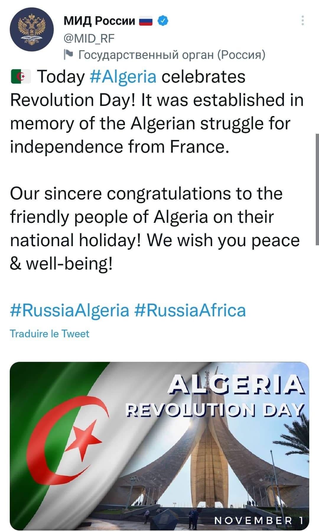 وفي تغريدة لها عبر حسابها الرسمي على تويتر، قالت الخارجية الروسية:”اليوم الجزائر تحتفل بعيد الثورة، والذي أسس لذكرى النضال الجزائري من أجل الإستقلال عن فرنسا”.