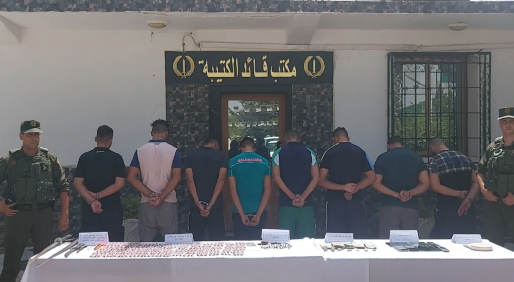 وأوضح نفس المصدر، أنه في إطار محاربة الجريمة المنظمة بشتى أنواعها، تمكنت وحدات الكتيبة الإقليمية للدرك الوطني بالعطاف (عين الدفلى) من توقيف 8 أشخاص تتراوح أعمارهم بين 26 و37 سنة، وذلك بناء على استغلال معلومات واردة مفادها وجود عصابة إجرامية تنشط في مجال المتاجرة بالمخدرات والمؤثرات العقلية وقد أسفرت العملية عن توقيف المشتبه فيهم مع حجز كمية معتبرة من المؤثرات العقلية، والمتمثلة في 1234 كبسولة من نوع بريغابالين وكمية من الكيف المعالج المهيأ للبيع على شكل قطع كما تم حجز أسلحة بيضاء و11 هاتفا نقالا ومبلغ مالي يقدر بـ29 مليون سنتيم من عائدات الترويج، بالإضافة إلى سيارة سياحية ودراجتين ناريتين. وعقب استفاء جميع الإجراءات القانونية، سيتم تقديم المشتبه فيهم أمام وكيل الجمهورية لدى محكمة العطاف، وفقا لذات المصدر.