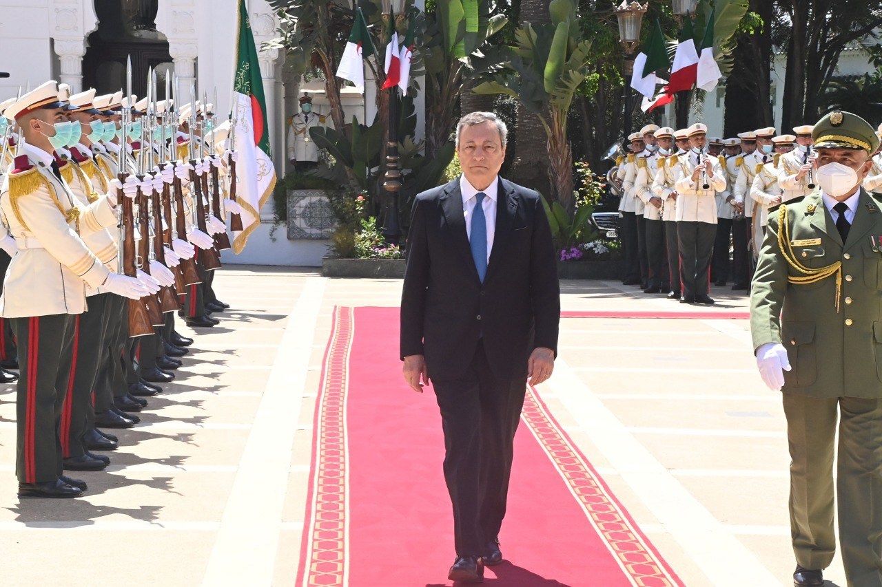 وقبلها، خص ماريو دراغي باستقبال رسمي ببهو مقر رئاسة الجمهورية، حيث استعرض تشكيلة من الحرس الجمهوري أدت له التحية الشرفية.