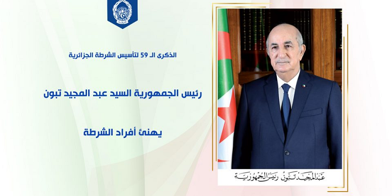 وجه رئيس الجمهورية، عبد المجيد تبون، رسالة تهنئة إلى أفراد الشرطة بمناسبة الاحتفال بالذكرى الـ59 لتأسيسها.