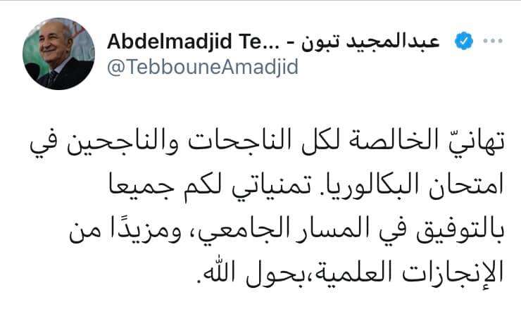 وقال الرئيس تبون “تهانيّ الخالصة لكل الناجحات والناجحين في امتحان البكالوريا، تمنياتي لكم جميعا بالتوفيق في المسار الجامعي، ومزيدًا من الإنجازات العلمية،بحول الله”.