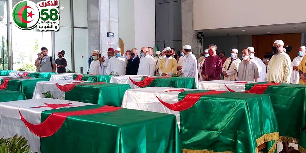 وأكد الرئيس تبون يوم الخميس الماضي أن تلك هي الخطوة الأولى وأن الدولة عازمة على إتمام هذه العملية حتى يلتئم شمل جميع شهداء الجزائر فوق أرضهم.وسيشيع الشهداء الـ24 اليوم الأحد بمربع الشهداء في مقبرة العالية بالجزائر العاصمة، وهذا في الذكرى 58 لعيدي الاستقلال والشباب ،وعادت الجمعة إلى أرض الوطن قادمة من فرنسا، الدفعة الاولى لرفات جماجم المقاومين الجزائريين للإستعمار الفرنسي، التي كانت محتجزة لمدة قرن ونصف القرن بمتحف التاريخ الطبيعي بباريس، في حفل استقبال رسمي ومهيب، أشرف عليه رئيس الجمهورية عبد المجيد تبون.