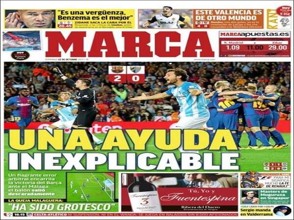 أما صحيفة “ماركا” فأشارت إلى الخطأ التحكيمي في الهدف الأول لبرشلونة بعنوان “مساعدة غير مفهومة” مبرزة شكاوى لاعبي مالاغا من الحكام ومؤكدة أن هذا الخطأ لا يغتفر و”ساعده برشلونة على تحقيق الفوز”.