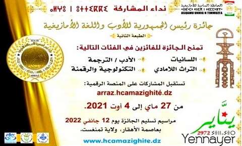 وكانت المحافظة السامية للأمازيغية أعلنت يوم 26 ماي المنصرم عن فتح باب المشاركة في الطبعة الثانية لجائزة رئيس الجمهورية للأدب واللغة الأمازيغية أمام المترشحين ابتداء من 27 ماي إلى غاية أمس 04 أوت المقبل، حيث أن قانون المسابقة وشروط المشاركة وكيفيات الترشح متوفرة على الموقع الإلكتروني للمحافظة.