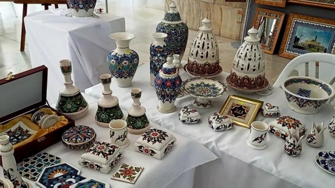وتنوعت تشكيلات المعروضات ما بين الأواني والأطقم المستعملة في الحياة اليومية، إلى جانب التحف المستعملة في التزيين مثل المرايا وكذا لوحات تزيينية المصنوعة من السيراميك والتي تحمل آيات قرآنية مكتوبة بالخط العربي الجميل.