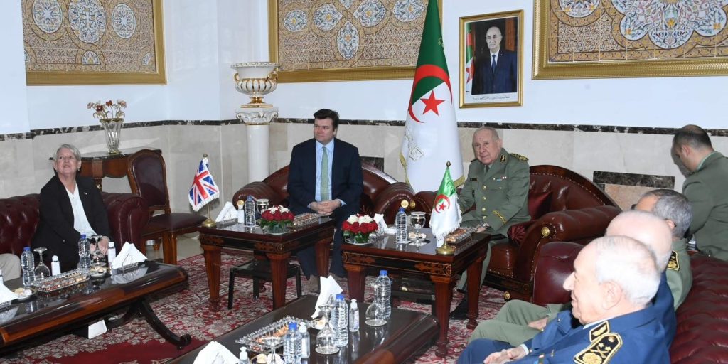 استقبل، الأحد، الفريق أول السعيد شنقريحة، رئيس أركان الجيش الوطني الشعبي، وزير الدولة المكلف بالقوات المسلحة البريطانية، جايمس ستيفان هيبي، الذي يقوم بزيارة عمل إلى الجزائر على رأس وفد هام.