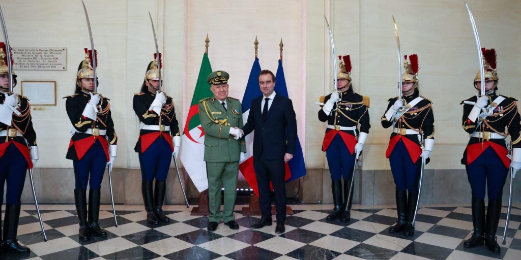 وأوضح البيان، أنه في اليوم الثاني من الزيارة الرسمية التي يقوم بها إلى فرنسا ستُقبل السيد الفريق أول السعيد شنقريحة، رئيس أركان الجيش الوطني الشعبي من قبل، السيد سيباستيان لوكورنيه، وزير الجيوش الفرنسية بمقر الوزارة أين قدمت له تشكيلات من مختلف القوات الفرنسية التشريفات العسكرية، إثر ذلك –يضيف البيان– كان للسيد الفريق أول، رئيس أركان الجيش الوطني الشعبي اجتماع موسع مع وزير الجيوش الفرنسية بحضور السيد الفريق أول تيري بورخارد، رئيس أركان الجيوش الفرنسية، وتطرقت المباحثات -مثلما أوضح المصدر- إلى السبل الكفيلة بتعزيز التعاون العسكري والأمني، ليتكلل الاجتماع بالتوقيع على ورقة طريق مشتركة. وخلص البيان في الختام، على توقيع السيد الفريق أول السعيد شنقريحة، رئيس أركان الجيش الوطني الشعبي، على السجل الذهبي لوزارة الجيوش الفرنسية.