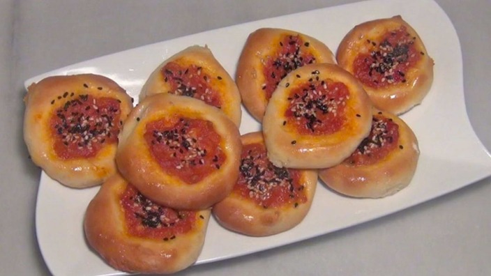 - نضع مقدار ملعقة صغيرة من الحشوة في وسط كل قرص عجين وننثر القليل من السمسم وحبة البركة، ثم نغطي الصينية بورق نايلون غذائي ونتركها ترتاح لمدة ساعة بدرجة حرارة الغرفة ثم تطهى.