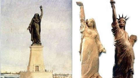 صمم النحّــات الفرنسي، فريدريك بارتولدي، نموذجـاً مُصغراً لتمثال السيـدة التي في الصــورة، في عهـد الخديـوي إسماعيل باشــا، وقام بعرضه على الخديوي إسماعيــل، ليتم وضعه على مدخل قناة السويس التي كان يتم افتتاحها في ذلك الوقت ، لكن إسماعيــل اعتذر عن قبول اقتراح التمثال الفرنســي، نظراً للتكاليف الباهظــة التي يتطلبها هذا المشــروع، خاصة بعــد تكاليــف حفــر القنـاة وافتتاحها لذلك، فقامت فرنســا بإهداء التمثــال إلى الولايات المتحدة الأمريكيـــة في ذكـرى احتفالها المئوي لإعلان استقلالها، بعد أن غيــر النحات شكل التمثال، وجعلـه بالشكــل