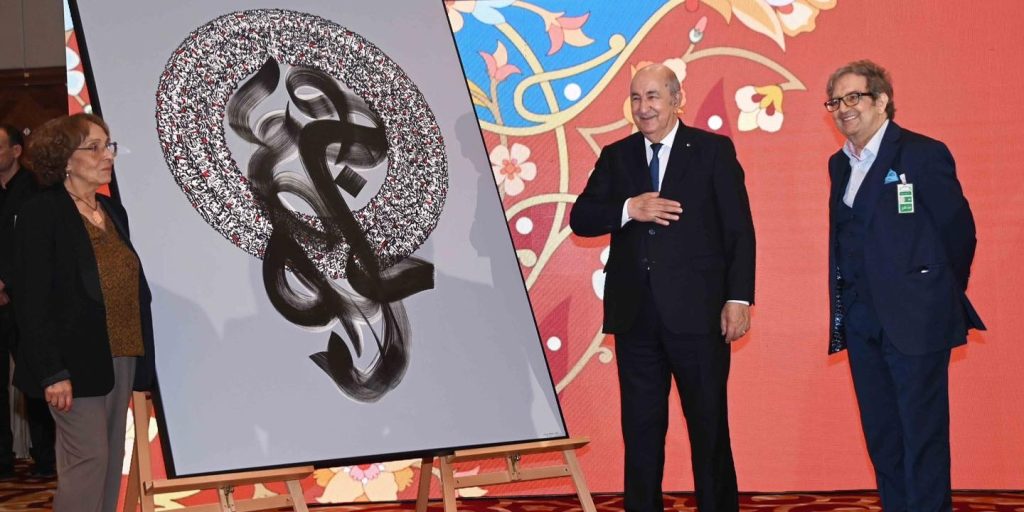 بمناسبة احتفالات اليوم الوطني للفنان بالمركز الدولي للمؤتمرات “عبد اللطيف رحال” (الجزائر العاصمة)، جرى تكريم رئيس الجمهورية، بإهدائه لوحة فنية للخط العربي من أعمال الفنان التشكيلي حمزة بونوة، سلّمها الفنانان القديران سيد أحمد أقومي وفاطمة حليلو نيابة عن الأسرة الفنية.