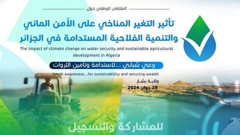 ينظّم المجلس الأعلى للشّباب من خِلال لجنة البيئَة والتنمية المُستدامة مُلتقى وطَني حَول “تأثير التغيرات المُناخية على الأمن المَائي والتنمية الفِلاحِية في الجَزائر”، يَومي 28 و29 جوان الجاري بعاصِمة الساورة ولاية بشار، تَحت شِعار “وعي شَبابي… لاستدامة وتأمين الثّرَوات”.