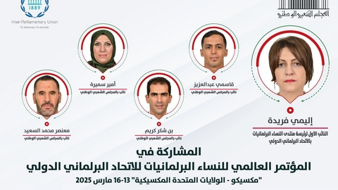 وأوضح المصدر ذاته, أن الوفد يتكون من السيدة فريدة إليمي, النائب الأول لرئيسة منتدى النساء البرلمانيات بالاتحاد, السيدة سميرة أمير إلى جانب السادة نواب المجلس الشعبي الوطني, قاسمي عبد العزيز, بن شكر كريم ومعنصر محمد السعيد.
