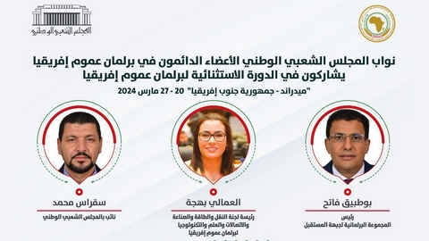 وكشف بيان للمجلس الشعبي الوطني، الأربعاء، أن هذه الدورة الاستثنائية ستعرف إجراء انتخابات، لشغل مناصب رئيس البرلمان ونائبيه الأول والرابع. وللإشارة، يتألف وفد المجلس الشعبي الوطني، المشارك في هذه المهمة، من بهجة العمالي، رئيسة لجنة النقل والطاقة والصناعة والاتصالات والعلم والتكنولوجيا لبرلمان عموم إفريقيا، وكذا فاتح بوطبيق، رئيس المجموعة البرلمانية لجبهة المستقبل والنائب محمد سقراس.