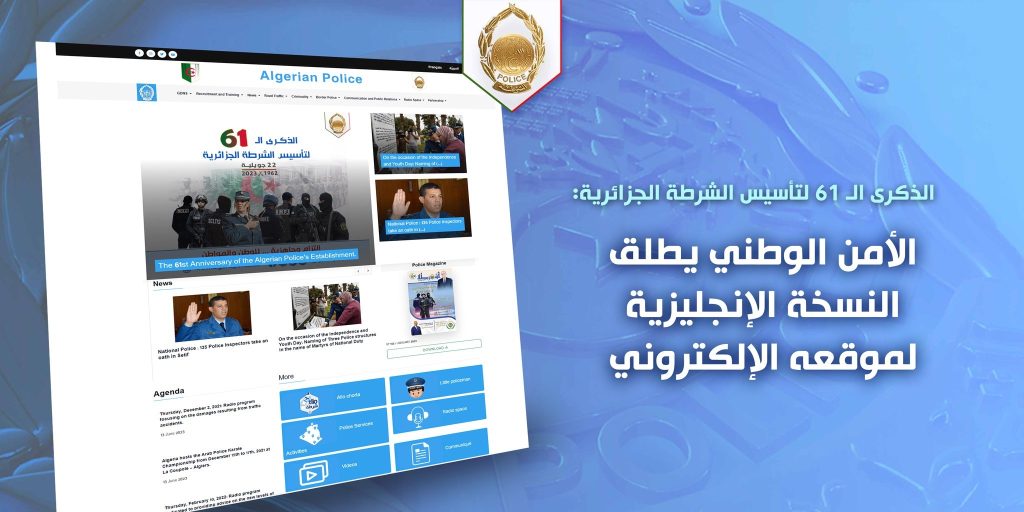 تزامنا والاحتفال بالذكرى الـ61 لتأسيس الشرطة الجزائرية، أطلقت المديرية العامة للأمن الوطني، النسخة الإنجليزية لموقعها الإلكتروني www.algeriepolice.dz، كإضافة للنسختين العربية والفرنسية.