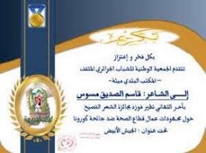 نال الشاعر قاسم صديق مسوس من ولاية تيارت، جائزة “أحسن قصيدة شعرية” في المسابقة الوطنية الخاصة بتكريم مستخدمي قطاع الصحة، نظير جهودهم في مواجهة جائحة كورونا، حسب ما علم من سمير غيشي رئيس المكتب البلدي للجمعية الوطنية للشباب الجزائري المثقف المبادر لتنظيم المسابقة.