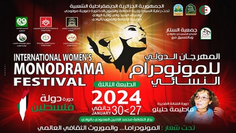 ستنزل 21 دولة، ضيفة على وادي سوف مدينة ألف قبة وقبة، للمشاركة في الطبعة الثالثة للمهرجان الدولي للمونودرام النسائي” دورة فاطمة حليلو” المقررة من 27 إلى 30 جانفي الجاري، تحت شعار “المونودراما والموروث الثقافي العالمي”.