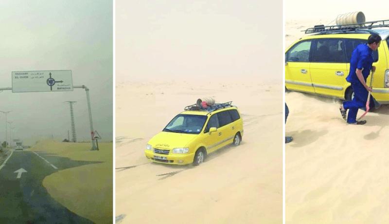 أدت الرياح القوية التي شهدتها ولاية الوادي، أمس، في غمر عدة طرقات بالرمال، خاصة طريق القداشي بين الرباح وحاسي مسعود وطريق النخلة دوار الماء من الجهة الجنوبية، وبعض المنعرجات بكل من طريق النخلة الرباح إلى غاية مفترق الطرق الطريفاوي الوادي التي أغلقت بالكامل.