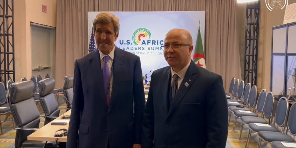 استقبل الوزير الأول، السيد أيمن بن عبد الرحمان، بواشنطن، المبعوث الخاص لرئيس الولايات المتحدة الأمريكية للمناخ، السيد جون كيري، وذلك على هامش مشاركته في القمة الأمريكية الإفريقية، ممثلا لرئيس الجمهورية، السيد عبد المجيد تبون.