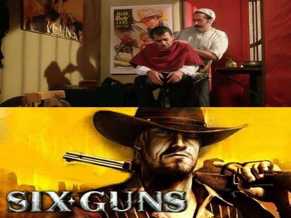 مصمم الديكور في هذا العمل وقع بخطأ كبير، حيث يعود البوستر الأيمن إلى لعبة بعنوان “Six-guns” التي أصدرتها شركة “game-loft” في عام 2011 عن فيلم بنفس العنوان خرج سنة 2010، ما يعني أن الفرق بين الحدث والديكور يقارب الخمسين عاماً.