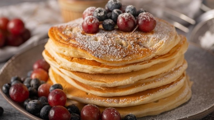 عند التقديم تزين بفواكه طازجة مع العسل أو الشوكولاطة أو السكر الناعم حسب الرغبة.