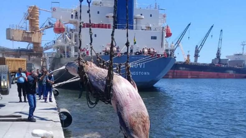 ونشرت مديرية الصيد البحري وتربية المائيات بولاية بجاية، صورا لعملية انتشال جثة الحوت النافق من حوض الميناء.