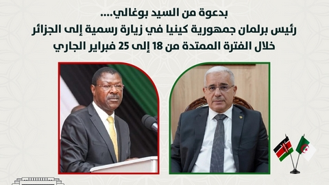 يشرع موسى ويتا نغانغولا، رئيس برلمان جمهورية كينيا، في زيارة رسمية إلى الجزائر خلال الفترة الممتدة من 18 إلى 25 فيفري الجاري، حيث تأتي هذه الزيارة استجابة لدعوة رئيس المجلس الشعبي الوطني، إبراهيم بوغالي.