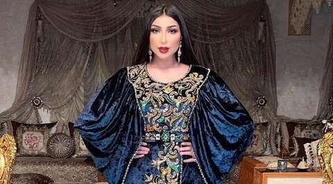 واختارت دنيا بطمة إطلالة جميلة وأنيقة بقفطان طويل فضفاض بأكمام طويلة ومكشوف عند منطقة الساق، باللون الكحلي، ومزين بتطريزات جميلة عند منطقة الصدر.