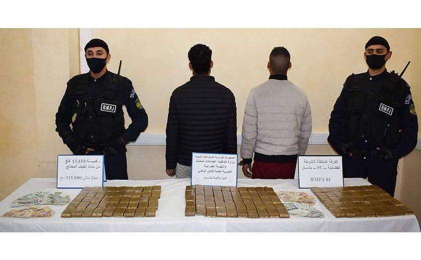 وتم خلال العملية، توقيف شخصين، مع حجز 13 كلغ و153 غراما من المخدرات من نوع الكيف المعالج، ومبلغ مالي بالعملة الوطنية قدر بـ 215.000 دج.
