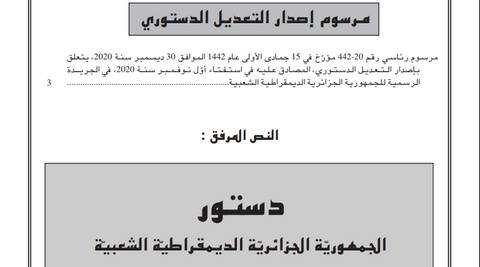 الجزائر -نشر في العدد الأخير من الجريدة الرسمية المرسوم المتعلق بإصدار التعديل الدستوري المصادق عليه في استفتاء أول نوفمبر المنصرم وصادق عليه رئيس الجمهورية عبد المجيد تبون الخميس الفارط .