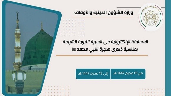 ذكرت وزارة الشؤون الدينية والأوقاف, في بيان لها, بتنظيمها لمسابقة إلكترونية في السيرة النبوية موجهة لفائدة تلاميذ الطورين الابتدائي والمتوسط, وذلك بمناسبة حلول العام الهجري الجديد 1447.
